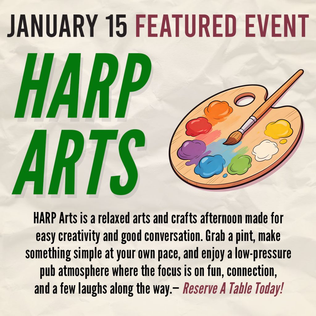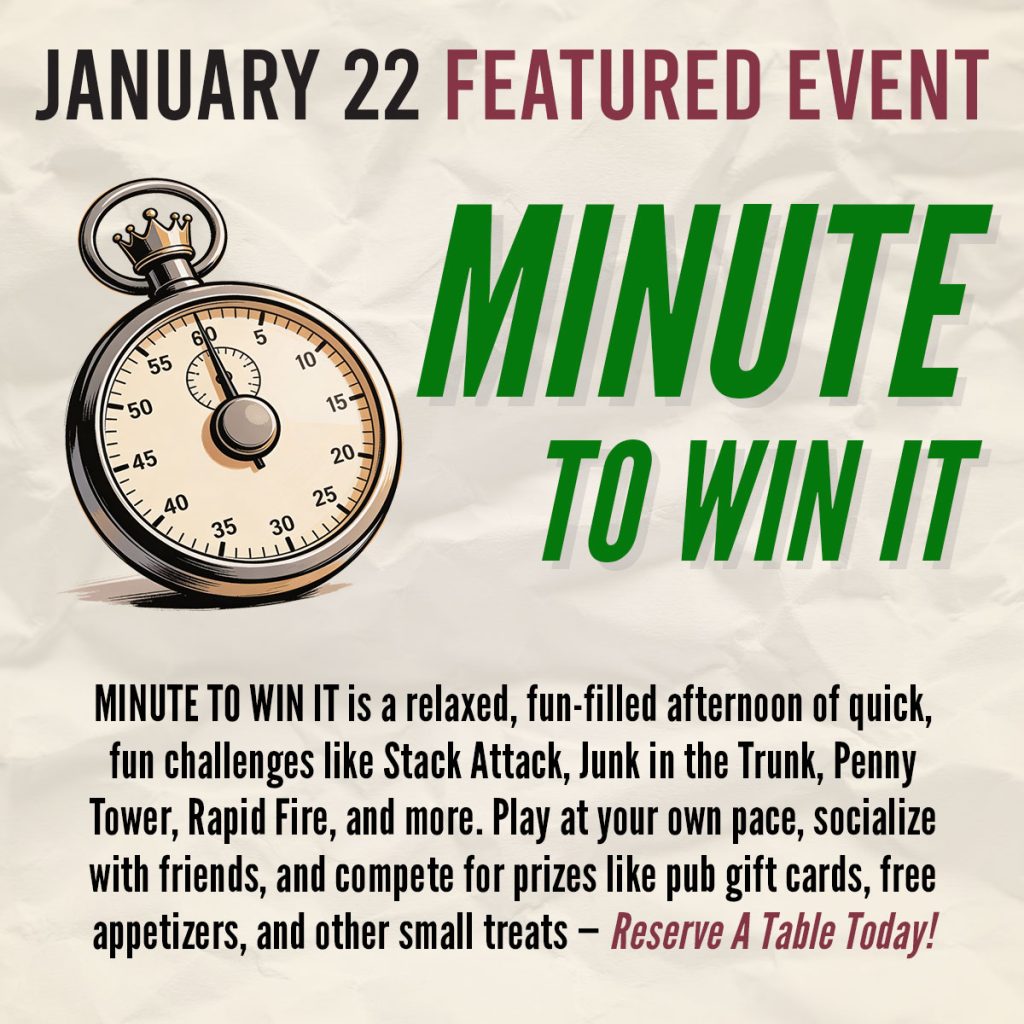 These free, drop-in games are meant to spark conversation, meet new faces, and give our regulars something fun to do before the evening crowd rolls in. No cover, no commitment—just good people, good humor, and a proper pub atmosphere. Whether you’re a familiar face or someone who’s quietly become one, this is for you. Starting January 8th—check back here for the week’s upcoming feature event, or join our Inner Circle for updates direct to your inbox!